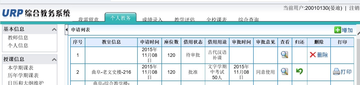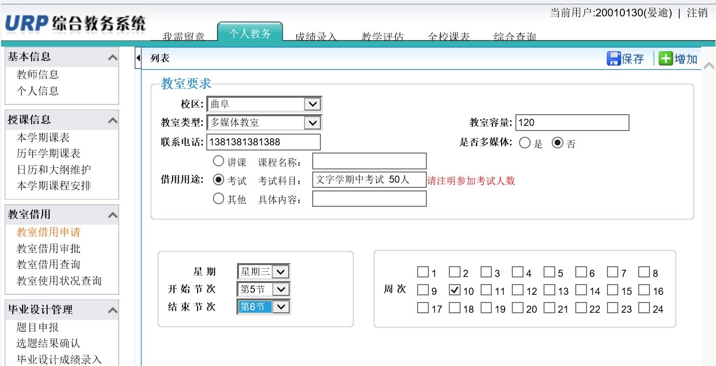 1.教师在学校信息门户登陆后,进入教务系统,在“个人教务”模块,点击左侧的“教室借用申请”,点击右上角的“增加”,即可增加一条教室借用申请。填写清楚系统提示的各项内容即可。注意周次要按校历的实际周次勾选。